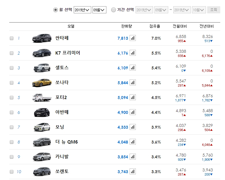 2019년 9월 자동차 판매량 TOP10 입니다.